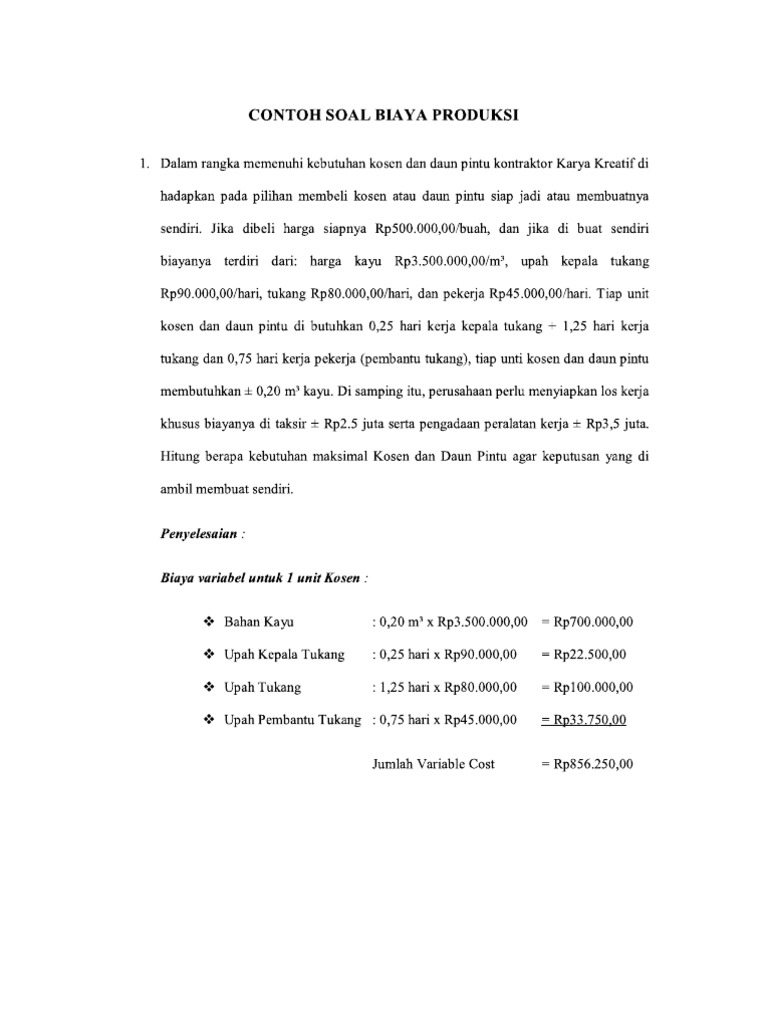 Biaya bahan baku yang dipakai untuk pesanan 461 adalah sebesar rp 400000 dan biaya tenaga kerja langsung sebesar 1500 jam dengan tarif rp 500 per jam. Biaya produksi harga jual dan banyaknya penjualan. Jika perusahaan menyusun laporan keuangan terutama laporan laba dan rugi maka harus. Teori produksi eco tech. Admin blog contoh soal terbaru 2019 juga mengumpulkan gambar gambar lainnya terkait contoh soal biaya produksi dan jawabannya dibawah ini. Untuk mendapat laba maksimum tersebut dipengaruhi tiga faktor utama yaitu.