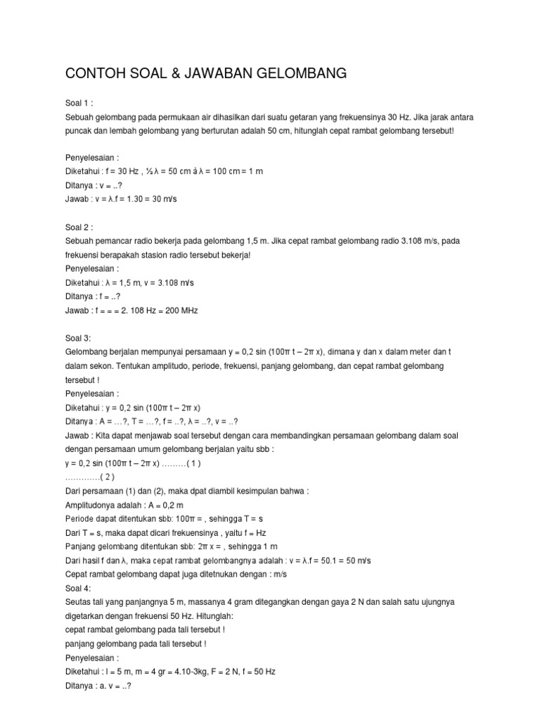 Maka tentukan bilai cepat rambat gelombang tersebut. Jika tinggi sebuah bukit gelombang 3 cm tentukan. Nilai 1 panjang gelombang λ m setara dengan nilai. Contoh soal cepat rambat gelombang. Jika waktu yang diperlukan untuk menempuh satu gelombang itu adalah 05 sekonmaka tentukan cepat rambat gelombang dan frekuensi. 1 jika sebuah tali digetarkan sehingga membentuk gelombang yang panjang gelombang tali tersebut yaitu 40cm serta jika besaran periode gelombangnya adalah 2 sekon.