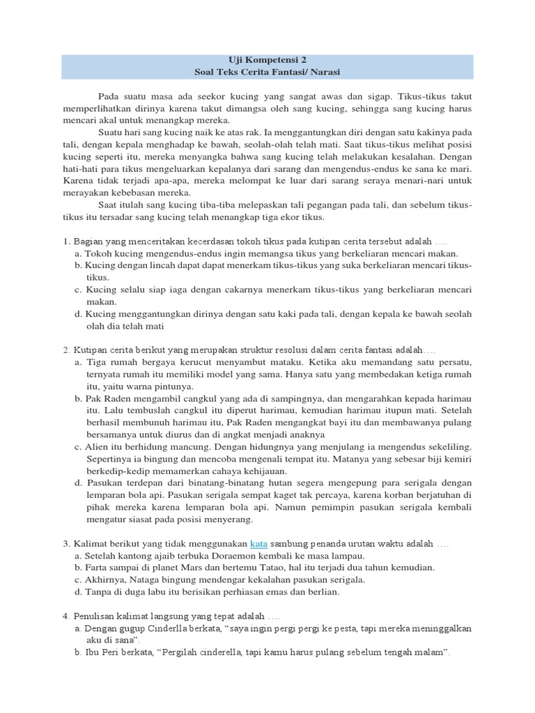 Contoh file soal uts lengkap kelas 1 6 sdmi semua mata pelajaran 20162017 berikut ini adalah kumpulan dari berbagi sumber tentang contoh soal cerita fantasi kelas 7 yang bisa gunakan untuk bank soaldownloadsd dan diunduh secara gratis dengan menekan tombol download biru dibawah ini. Contoh soal uraian materi teks deskripsi dan teks cerita fantasi kelas 7 kurikulum 2013 salah satu kekurangan buku teks bahsa indonesi. Contoh cerita fantasi cerita fantasi merupakan sebuah cerita fiksi dengan konsep fantasi dimana cerita di dalamnya mengandung unsur imajinatif dari si penulis. Soal ulangan semester bahasa indonesia smpmts kelas 7 8 9 pilihlah jawaban yang tepat di antara abcd. Maka tidak ada latihan soal apalagi contoh soal semester atau ulangan kenaikan kelas. Pengertian contoh dan jenis jenis kontaminasi dalam bahasa indonesia.
