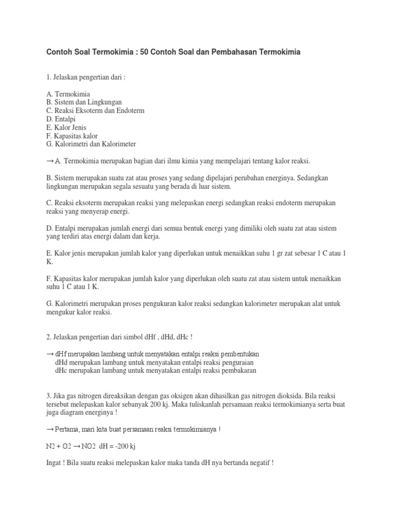 Contoh soal termokimia pilihan ganda dan pembahasannya bagian dari ilmu kimia yang mempelajari perubahan kalor atau panas suatu zat yang menyertai suatu reaksi atau proses kimia dan fisika disebut termokimiasecara operasional termokimia berkaitan dengan pengukuran dan pernafsiran perubahan kalor yang menyertai reaksi kimia perubahan keadaan dan pembentukan larutan. Pengertian persamaan reaksi rumus dan contoh soal tahukah anda apa yang dimaksud dengan termokimia. H 0 f h 2 so 4 l 84399 kj mol 1. Soal dan pembahasan termokimia pdf contoh soal hukum hess contoh soal kalorimeter fisika soal dan pembahasan laju reaksi rumus perubahan entalpi soal termodinamika soal dan pembahasan termokimia pdf soal termokimia pilihan ganda contoh soal kalorimeter fisika pada pembakaran 16 gram gas metana.
