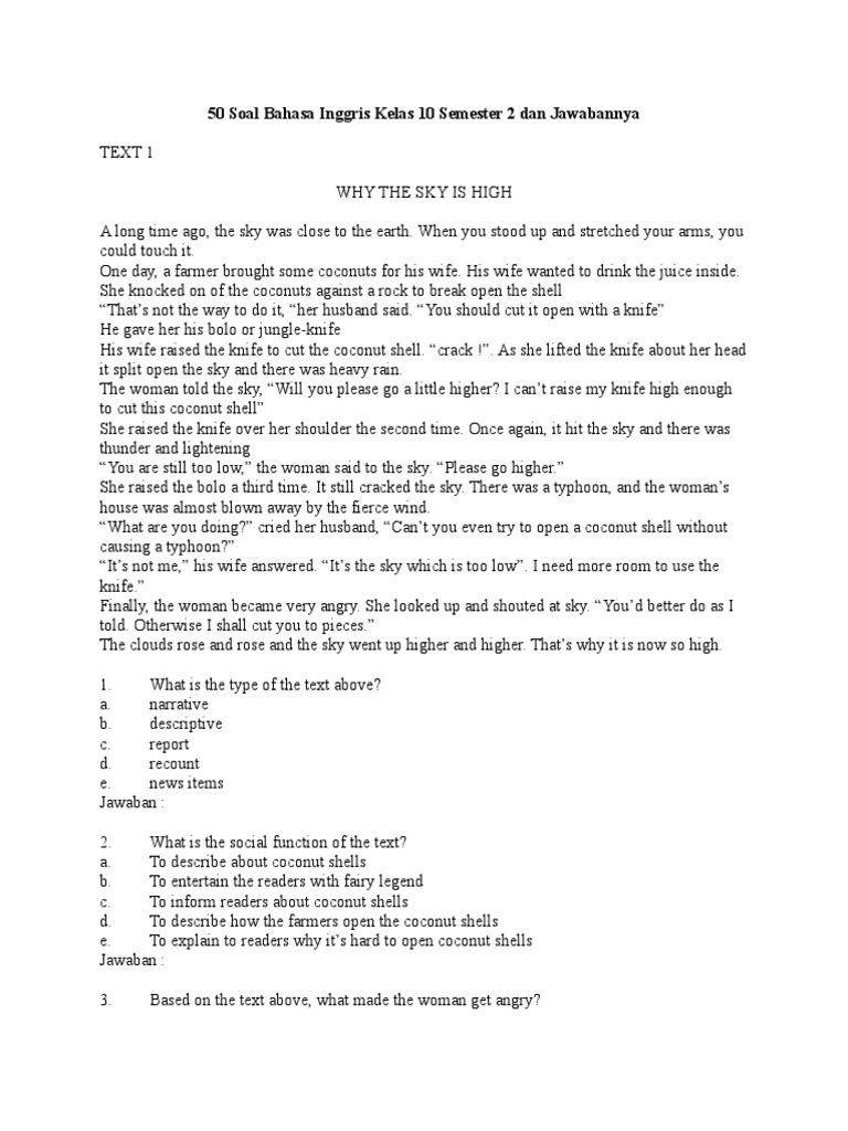 Soal cerita bahasa inggris ini diambil dari text singkat yang harus kita baca sebelumnya sebelum mengerjakan soal dan menentukan jawaban yang tepat. Umumnya contoh soal lagu itu kita harus mencari sendiri jawabannya tetapi kesempatan ini disajikan kumpulan soal lagu beserta jawabannya sebagi media latihan belajara bahasa inggris baik kelas 10 11 atau 12. Dalam artikel ini saya akan membagikan 10 contoh soal descriptive text dan kunci jawaban terbaru untuk pelajar sekolah menengah atas kelas 10 11 atau 12 smasmkma. Yang sering ditanyakan dalam soal narrative adalah cerita sangkuriang the legend of lake toba the magic candle cerita timun mas princess and the pea malin kundang text cinderella dan cerita narative legenda lainnyamengenai contoh soal narrative text essay sebenarnya sama saja dengan soal multiple choice. Hari ini saya akan membahas contoh soal latihan pilihan ganda dan essay lengkap dengan kunci jawaban dan pembahasan. 10 soal pilihan ganda bahasa inggris untuk smp kelas 7 part ii beserta jawaban salah satu cara menguasai bahasa inggris yaitu dengan berlatih apakah sahabat sbi juga sering berlatih mengerjakan soal.