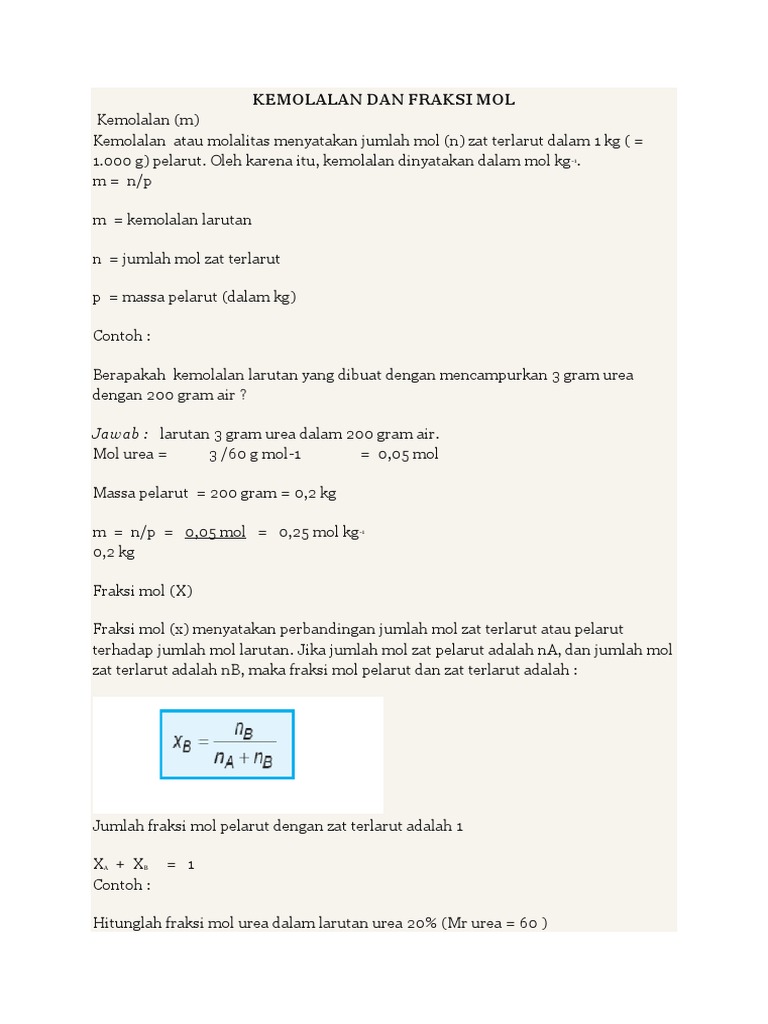 Pengertian rumus dan contoh soal molalitas dan fraksi mol lengkap molalitas atau kosentrasi molal adalah ukuran konsentrasi dari suatu zat terlarut di dalam suatu larutan dalam hal jumlah zat dalam sejumlah massa tertentu dari pelarut. Hitung fraksi mol masing masing zat pembahasan.
