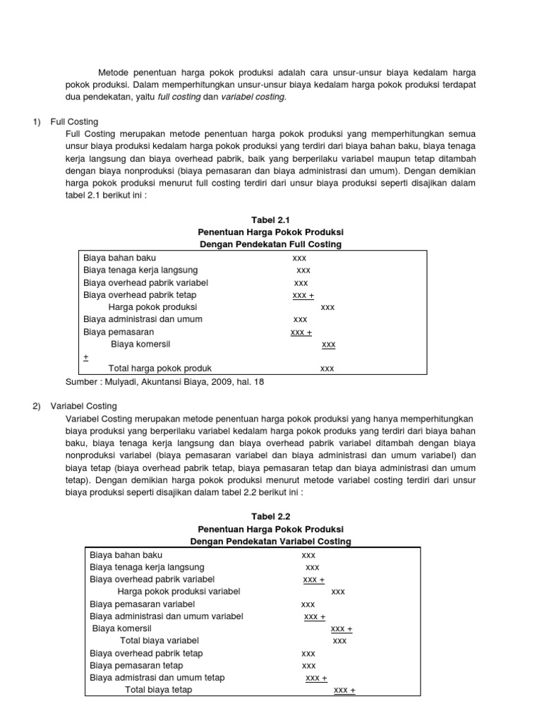 Contoh soal variabel costing dan absorption costing. Penentuan harga pokok produksi metode variable costing full costing perbandingan metode full costing dengan metode variable costing. Full costing adalah metode akuntansi manajemen yang menjelaskan bahwa semua biaya tetap dan biaya variabel termasuk semua biaya produksi lainnya digunakan untuk menghitung total biaya per unit harga pokok produksi. Contoh soal direct costing dan full costing. Dikenal juga dengan absortion atau conventional costing. Contoh soal dan jawaban sewa guna usaha keputusan melakukan leasing atau tidak pt.