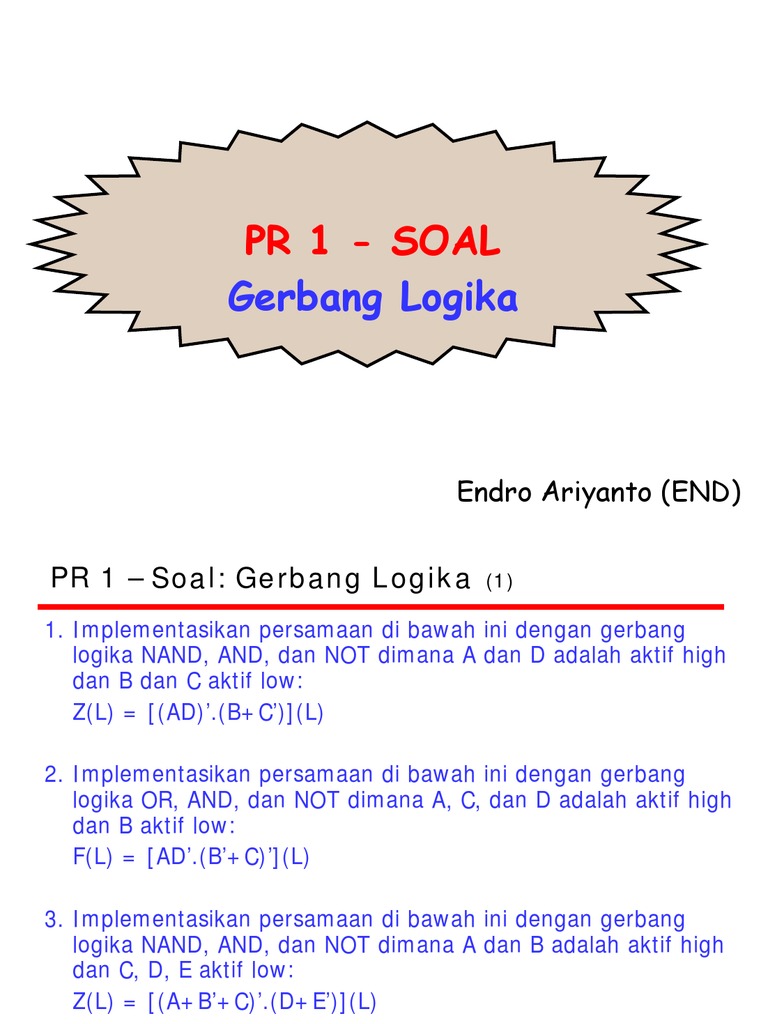 Suatu gerbang and dengan masukan a dan b diberi masukan grafik logika seperti gambar berikut. Gerbang logika beroperasi berdasarkan sistem bilangan biner yaitu bilangan yang hanya memiliki 2 kode simbol. Contoh soal gerbang logika dan penyelesaiannya gerbang gerbang logika dasar yang sering digunakan sebagai implementasi dari penyederhanaan fungsi logika adalah gerbang and not dan or. Xnor gate output akan berlogika 1 jika kedua input berlogika sama. Soal latihan gerbang logika buatlah rangkaian dan tabel kebenaran dari soal latihan dibawah ini. Not or nand 9gerbang logika bentukan terdiri dari a.