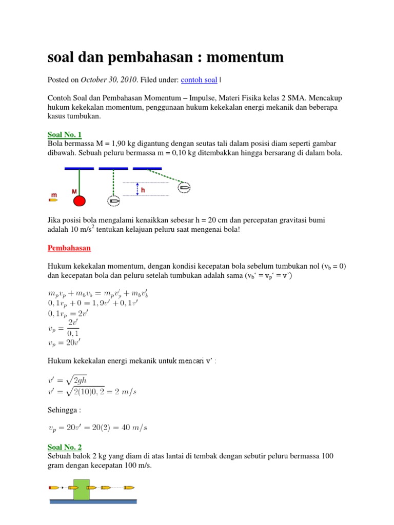 Contoh soal hukum kekekalan momentum. Pedoman lengkap belajar hukum kekekalan momentum mulai dari pengertian rumus bunyi tumbukan dan contoh soal latihan beserta pembahasan. Contoh 1 sebuah bola bermassa 01 kg mula mula diam kemudian setelah dipukul dengan tongkat dan kecepatan bola menjadi 20 ms. Pengertian momentum dan impuls rumus contoh soal dan jawaban momentum dan impuls lengkap apabila kalian berada di dalam mobil bus yang sedang bergerak dengan kecepatan cepat lalu direm secara mendadak pasti kalian merasakan bahwa badan kalian terlempar ke depan. Aplikasi dalam contoh soal. Berikut ini beberapa contoh soal mengenai impuls momentum dan tumbukan beserta pembahasannya. Contoh soal hukum gravitasi universal newton.
