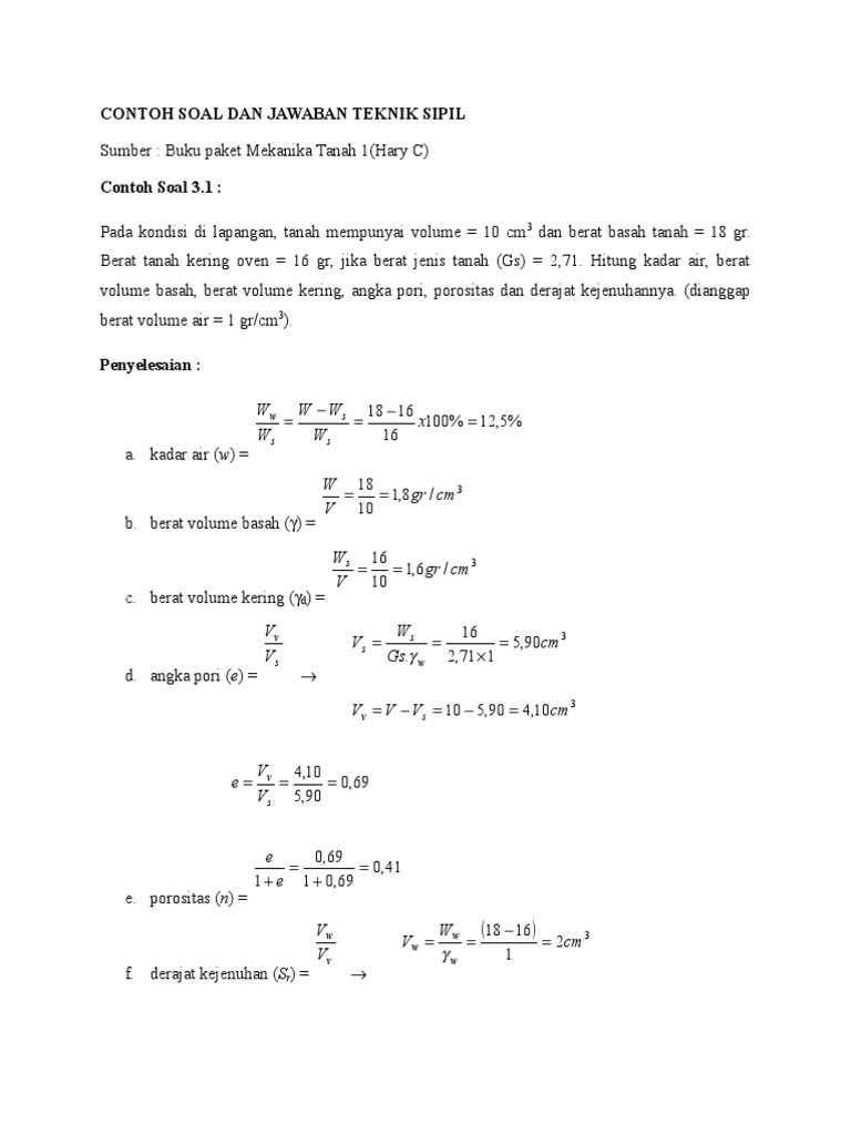 Contoh soal mekanika tanah. Dengan menganggap berat jenis tanah 27 dan berat jenis air 1 hitung derajat kejenuhan dari contoh tersebut jika tanah kemudian menjadi jenuh hitung berat volumenya. Suatu contoh tanah tak jenuh yang diambil dari lokasi tanah timbunan mempunyai kadar air 20 dan berat volume basah 2 gcm 3. Massa suatu contoh tanah basah yang diambil dari lapangan adalah 465 gram dan masa tanah. Mekanika tanah teori soal dan penyelesaian bambang surendro andi demikian informasi yang dapat kami bagikan mengenai contoh soal mekanika tanah 2 konsolidasi. Mekanika tanah adalah pengetahuan yang me nerapkan kaidah mekanika dan hidrolika untuk memecahkan persoalan. Pada tahun 1948 karl von te rzaghi seorang sarjana teknik sipil jerman austria berpendapat bahwa.