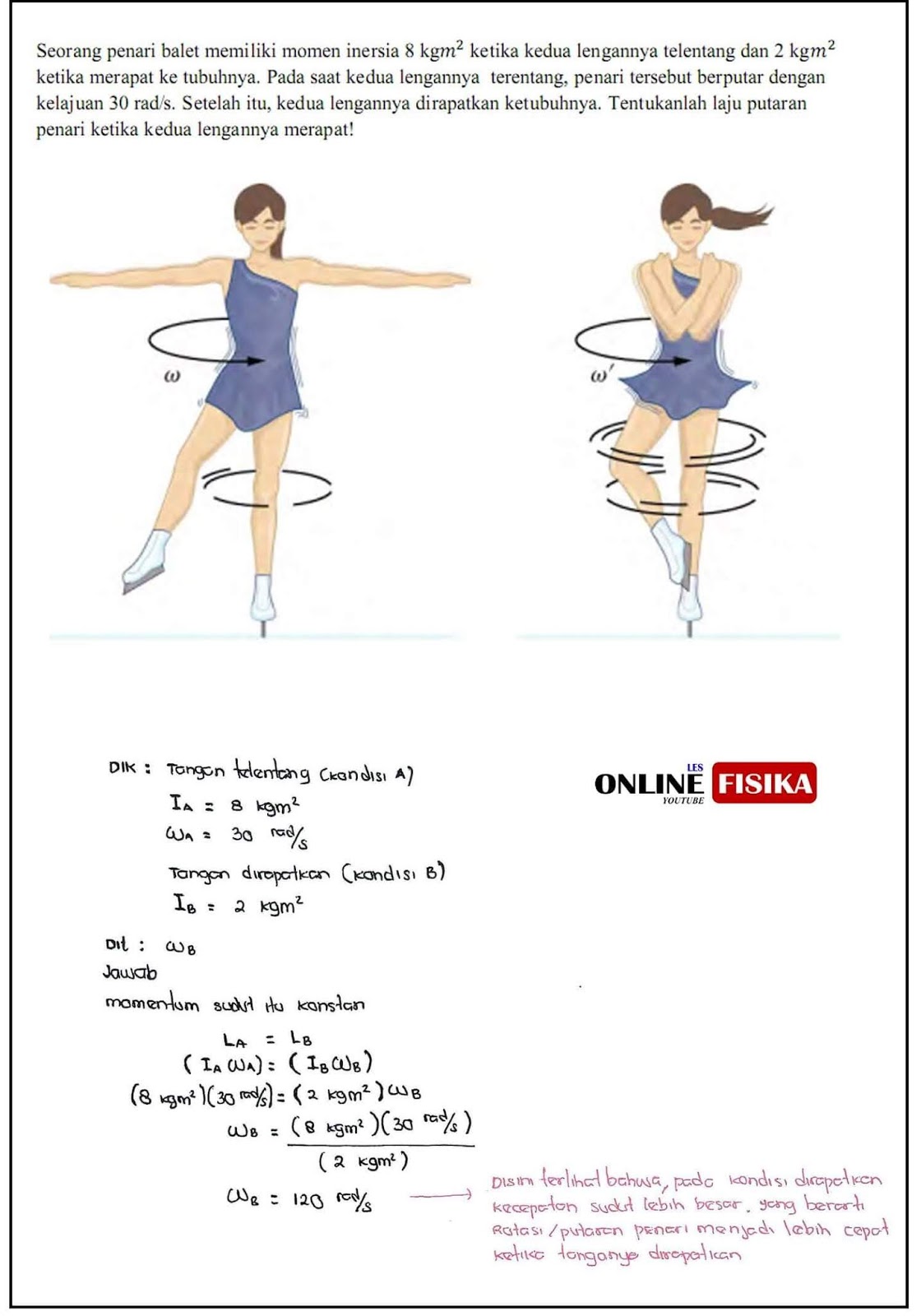 Jika keempat jari menyatakan arah gerak rotasi maka ibu jari menyatakan arah momentum sudut. Suatu benda mempunyai momen inersia 2 kg m 2 dan berotasi pada sumbu tetap dengan kecepatan sudut 1 rads. Berikut ini beberapa contoh soal mengenai impuls momentum dan tumbukan beserta pembahasannya. Berapa momentum sudut benda tersebut. 4 kgm 2 rads. Contoh 1 sebuah bola bermassa 01 kg mula mula diam kemudian setelah dipukul dengan tongkat dan kecepatan bola menjadi 20 ms.