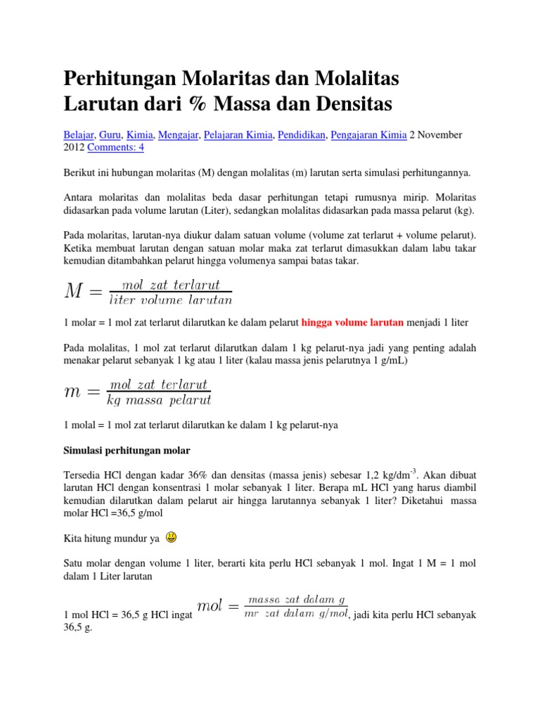 Kemolaran jika 100 ml larutan ini ditambah 400 ml air. Molaritas mula mula. Berikut ini adalah contoh soal dari penerapan molaritas yaitu. M 1 2m v 1. Cara mengencerkan larutan dan rumus pengenceran larutan adalah bahan kimia yang terdiri dari zat terlarut dan pelarutlarutan banyak kita gunakan di laboratorium kimia. Pengenceran larutan yaitu memperkecil konsentrasi larutan dengan jalan menambahkan sejumlah tertentu pelarut.