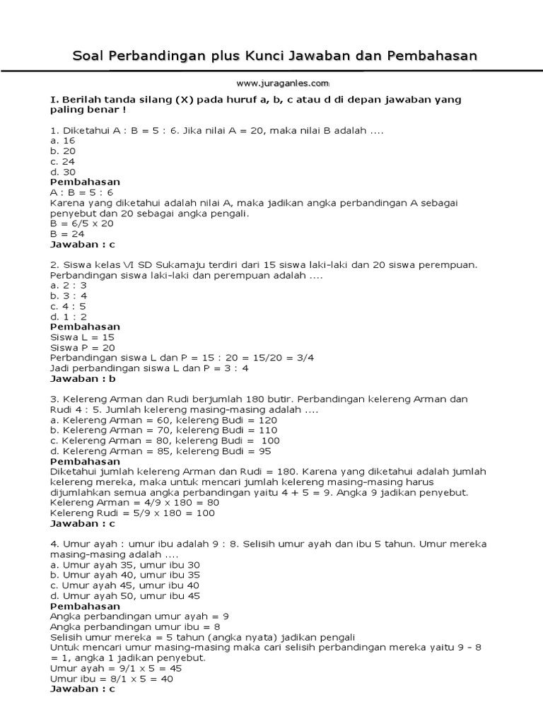 Temukan usia mereka saat ini. Namun saya memiliki cara mudah mengerjakan soal soal perbandingan yang biasanya saya ajarkan kepada anak anak les dan juga bisa adik adik terapkan kalau mau sih berikut ini adalah 30 soal perbandingan senilai dan perbandingan bertingkat 20 berupa pilihan ganda dan 10 soal isian yang sudah saya lengkapi dengan kunci jawaban. Rumus perbandingan memiliki contoh soal perbandingan yang dapat membantu anda dalam menguasai materi ini. Lima tahun dari sekarang rasio usia mereka adalah 4.