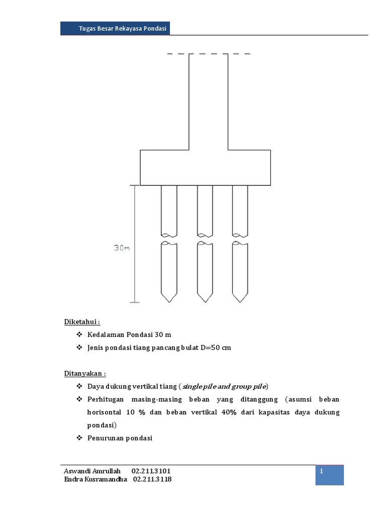 Contoh soal dan pembahasan pondasi cakar ayam february 18 2014 1 april 1 2013. Pondasi bore pile pondasi bored pile fungsinya sama dengan pondasi dalam lainya yaitu seperti pondasi tiang pancang. Contoh perhitungan beban normal maksimum n81407 ton. Tiang pancang beton 0305 m x 0305 m dipancang bengan steam hammer. Sedangkan diameter tiang 40 cm. Dari hasil ke tiga perhitungan di atas nanti daya dukung ijin tiang pancang yang akan dipergunakan adalah nilai daya dukung terkecil.