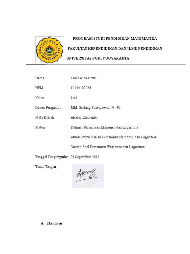 Contoh soal persamaan eksponen. Eksponen pangkat adalah nilai yang menunjukkan derajat kepangkatan. Kamu akan diajak untuk memahami materi hingga metode menyelesaikan soal. Kumpulan soal mudah sedang sukar. Syaratnya a tidak boleh sama dengan nol. Ke delapan sifat eksponen diatas harus kita pahami dan hafalkan karena sifat sifat eksponen tersebut adalah kunci untuk kita bisa mengerjakan soal soal eksponen. Cari himpunan penyelesaian dari persamaan eksponen 32x2 83x 1 0 jawab.