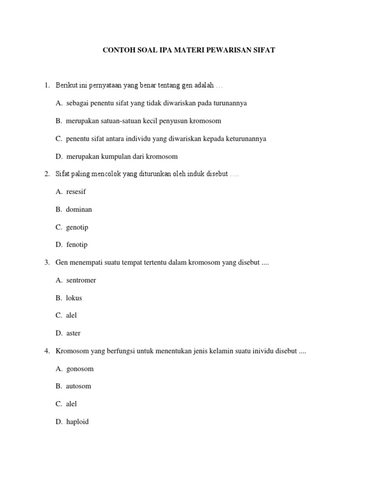 Contoh soal pewarisan sifat. Pewarisan sifat menjadikan makhluk hidup memiliki perbedaan sifat satu dengan lainnya. Kromosom adalah benang benang halus yang tersusun dari asam nukleat seperti dna dan rna. Contoh soal pewarisan sifat dan jawaban pewarisan sifat adalah ciri ciri atau sifat sifat makhluk hidup yang diturunkan dari generasi ke generasi atau diturunkan dari induk kepada anaknya. Maka persila 5 contoh soal pewarisan sifat pada persilangan dihibrid beserta jawabannya materikimia. Soal latihan ipa materi pewarisan sifat kelas 9 smp soal latihan ipa materi pewarisan sifat kelas 9 smp 1. Latihan soal un ipa smp materi pewarisan sifat dan pembahasannya.
