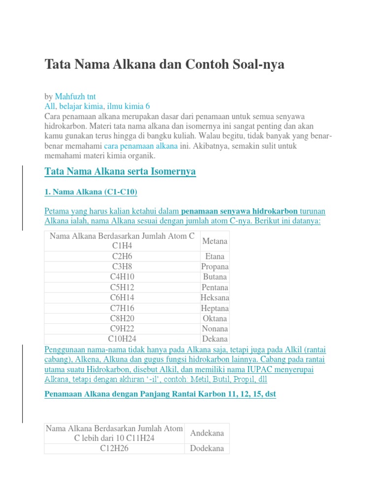 Contoh soal tata nama alkana. Alkana adalah senyawa hidrokarbon dengan rantai terbuka dan semua ikatan karbonnya merupakan ikatan tunggal. Pengertian alkana tata nama sifat kegunaan dan contoh alkana terlengkap senyawa hidrokarbon adalah senyawa yang mengandung unsur hidrogen dan karbon. Tata nama senyawa alkena aturan penamaan rumus struktur contoh soal kunci jawaban kimia secara umum penamaan alkena tidak jauh beda dengan penamaan alkanaperbedaannya terletak pada akhiran nama senyawa. Alkana adalah senyawa hidrokarbon alifatik jenuh yaitu hidrokarbon dengan rantai terbuka dan semua ikatannya adalah ikatan tunggal. Contoh soal alkana alkena dan alkuna alkana alkena dan alkuna merupakan salah satu tata nama senyawa yang mempunyai aturan dalam penamaannya. Tata nama alkana dan contoh soal nya by mahfuzh tnt posted on july 4 2015 september 27 2018.