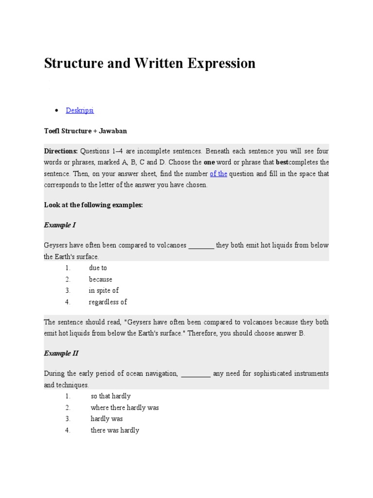 Hari ini saya akan mengulas tentang contoh soal toefl. Akhir kata semoga soal toefl structure and written expression dan bahasan di bawah ini dapat meningkatkan skor toefl anda. Dalam contoh soal di bawah ini setiap kalimat memiliki 4 kata atau frasa yang digarisbawahi. Karena berhubungan dengan grammer tidak jarang orang yang kesulitan mengerjakan soal di bagian ini. Grammar structure and written expression reading comprehension dan bagian. 310 nilai minimum sampai 677 nilai maximum untuk versi pbt paper based test.