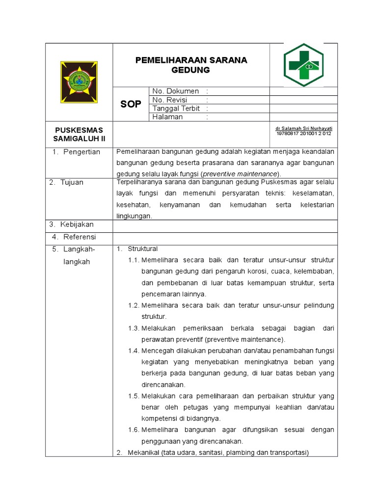 Yang termasuk dalam pengelolaan perawatan bangunan dimaksud adalah. 0647 1 comment download sop. Download sop pemeliharaan sarana gedung dan kendaraan bermotor tyanstory. Berikut ini adalah contoh dari sop pelaksanaan smd atau survey mawas diri yang biasanya diminta di bab 5. Pemeliharaan dan perawatan bangunan gedung 11 a. Sebagai pedoman perawatan bangunan bagi pengelola perbaikanrehab.