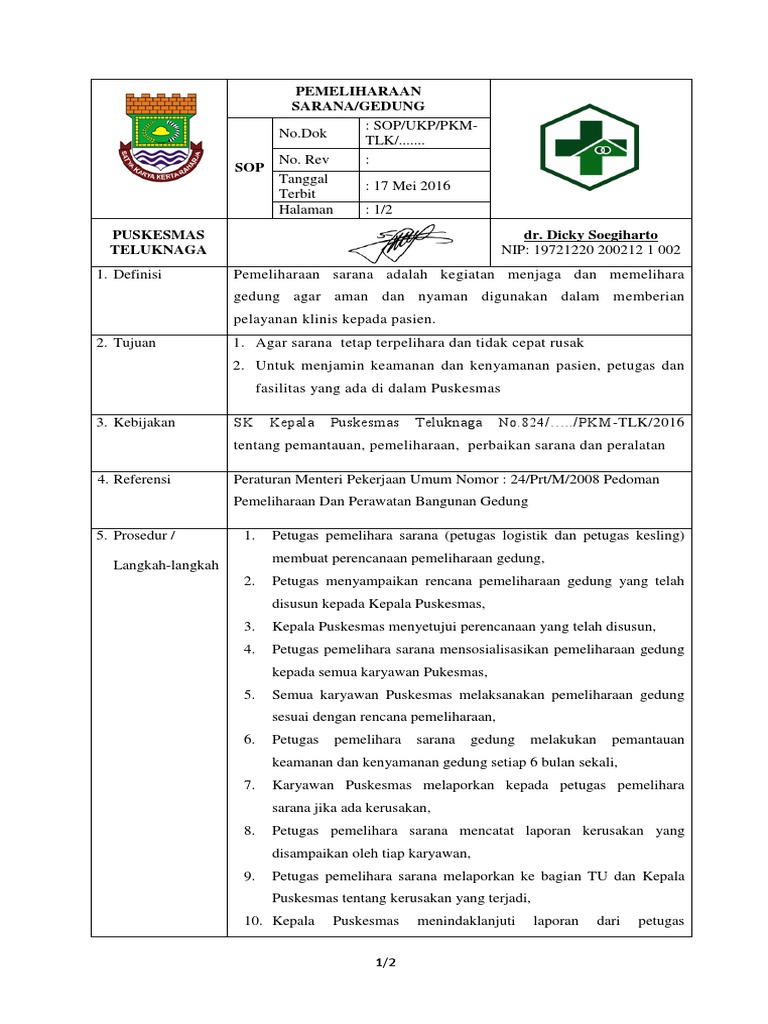 Persyaratan tenaga ahliterampil 12 bagian iii lingkup pemeliharaan dan perawatan bangunan gedung i. Dalam pelaksanaannya pemeliharaan sarana juga sangat diperhatikan untuk kelancaran pekerjaan di puskesmas. Terdiri dari 100 contoh sop perusahaan dari 10 departemen dengan total 1 19 halaman 100 flowchart contoh sop perusahaan dari 10 departemen dengan total 1 43 halaman 8 5 dokumen pendukung sop perusahaan dengan total 9 9 halaman dokumen peraturan perusahaan dan pedoman karyawan daftar isi contoh sop perusahaan. Pemeliharaan merupakan sistem yang terdiri dari beberapa elemen berupa fasilitas machine penggantian komponen atau sparepart material biaya pemeliharaan money perencanaan kegiatan pemeliharaan method dan eksekutor pemeliharaan man. Gedung bangunan laboratorium lapang kandang ternak greenhouse kolam percobaan dll pagar gapura monument menara dll.