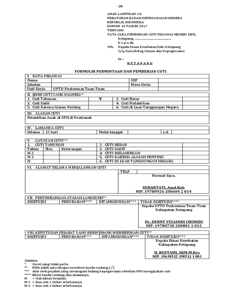 Demikian tadi mengenai cuti tahunan pns dan cara mengajukan cuti tahunan pns. Berikut kali ini saya akan membagikan contoh surat cuti tahunan pns terbaru. Formulir cuti pns sesuai peraturan bkn nomor 24 tahun 2017 berikut kali ini saya akan membagikan contoh surat cuti tahunan pns terbaru. Namun jika terdapat kesalahan atau kekeliruan penulisan serta format contoh surat permintaan cuti di atas kami memohon kritik dan saran serta masukan positif dari anda agar menjadi sempurnanya surat permohonan. Anda di halaman 1 dari 1. Pp no112017 ini menyebutkan pns dan calon pns yang telah bekerja paling kurang 1 satu tahun secara terus menerus berhak atas cuti tahunan.