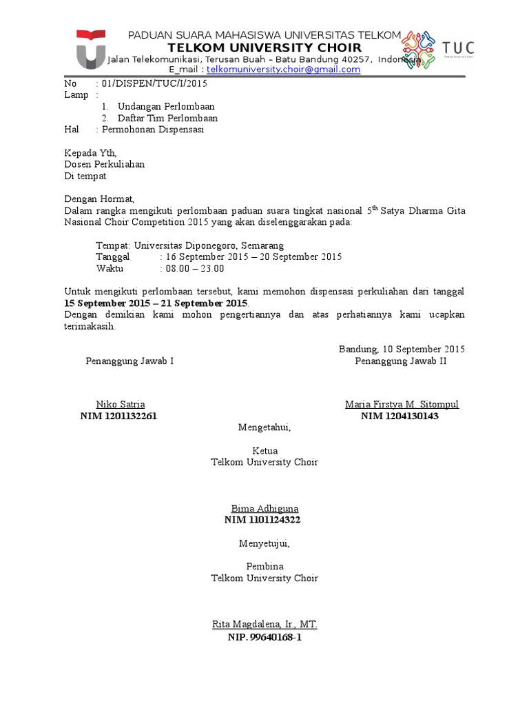 Contoh surat dispensasi organisasi. Nama dan alamat dari organisasi pengirim surat yaitu bisa dari organisasi masyarakat keagamaan pemerintahan perusahan swasta sekolah dan lain lain. Misalnya saja dalam perkuliahan dimana mahasiswa diberikan kebebasan untuk tidak masuk kuliah selama periode tertentu dikarenakan alasan yang tentunya harus jelas. Contoh surat dispensasi definisi format surat dispensasi kuliah dan organisasi surat dispensasi merupakan surat yang berisi alasan si pemohon atau pembuat surat karena tidak bisa melakukan kegiatan atau aktivitas tertentu dikarenakan ada hal lain yang harus diselesaikan. Terutama jika kantor tertentu sudah memiliki format surat dispensasi kerja misalnya maka tentu akan jauh lebih mudah dalam mengonsep surat saat dibutuhkan. Contoh surat dispensasi kuliah jenis surat yang satu ini dipergunakan untuk memberikan keringanan kepada seseorang atau kelompok tertentu secara resmi. Contoh surat dispensasi sekolah untuk berbagai kepentingan sebagai referensi untuk mengetahui bentuk surat dispensasi yang baik dan resmi.