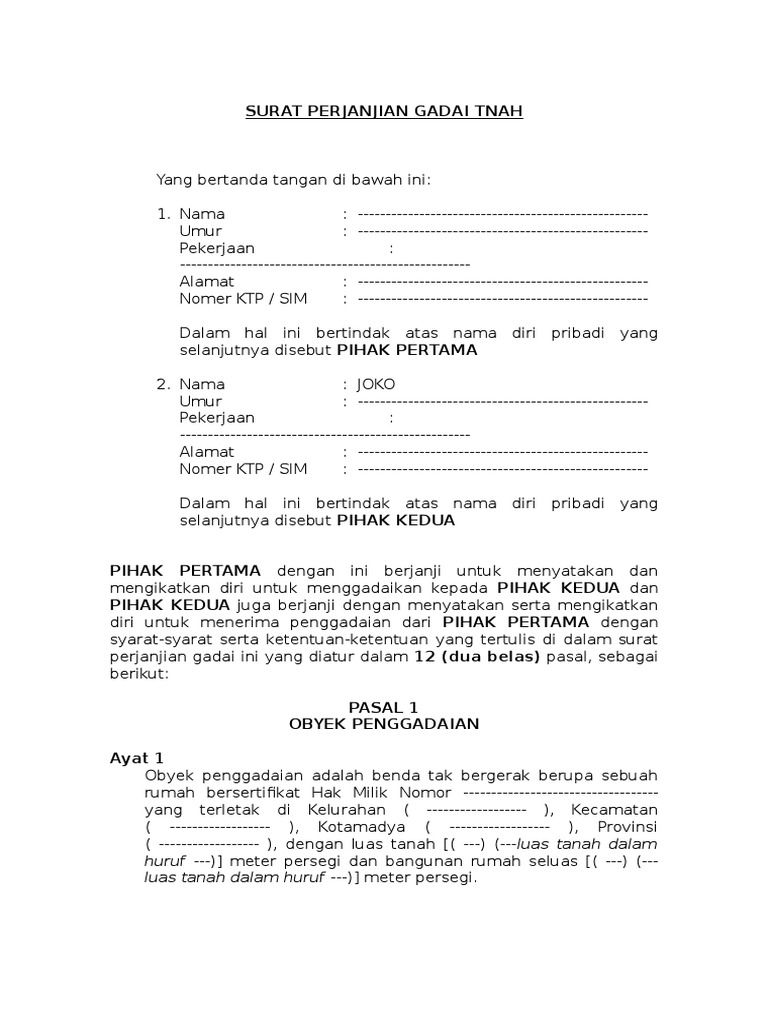 Misalkan saja jika anda memiliki suatu barang berharga maka anda bisa menjadikan barang tersebut sebagai jaminan atas hutang yang akan di terima. Gadai adalah hak yang diperoleh pemberi pinjaman atas suatu barang yang bergerak yang diberikan kepadanya oleh peminjam untuk menjamin suatu utang. Jika ya pasti anda membutuhkan surat perjanjian jika ingin menggadaikan tanah tersebut. Harga gadai atas tanah tersebut di atas adalah rp. Diskusikan perjanjian pembelian yang tertunda. Perjanjian gadai ini berlaku sejak tanggal perjanjian ini ditandatangani sampai pihak pertama hendak membayar dan melunasi atau menebus barang gadaiannya sebidang tanah berukuran ½ bau atau 250 bata apabila pihak pertama belum bisa menebus tanah garapan tersebut maka tanah tersebut masih bisa dikelola oleh pihak kedua.