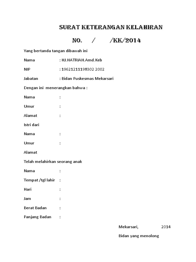 Semoga contoh surat ini bermanfaat untuk anda. Ya surat keterangan kelahiran ini diberikan kepada anak yang baru lahir di sebuah rumah bersalin yang ditangani oleh bidan.