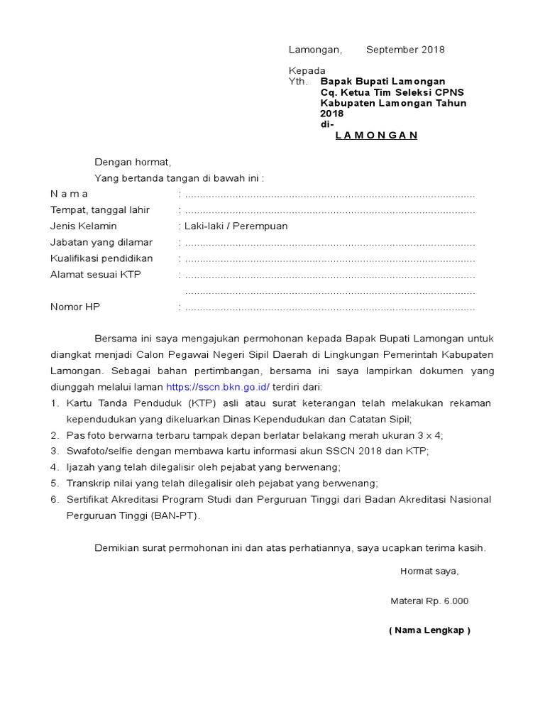 Surat lamaran tersebut selanjutnya diunggah melalui laman resmi penerimaan cpns. Kita akan melihat contoh surat lamaran kerja cpns atau ketika kamu melamar pekerjaan di instansi pemerintah seperti lembaga instansi kementerian sebagai status pns pegawai negeri sipil. Ini contoh surat lamaran cpns 2019 dan surat pernyataan cpns 2019 untuk sma s1 s2 dan diploma 25 contoh surat lamaran cpns 2019 untuk diunggah ke portal sscasnbkngoid unduh di sini. Sebagai bagian dari surat resmi surat permohonan kepada bupati harus memenuhi kaida kaidah dan aturan tertentu. Khususnya bagi yang telah menempuh pendidikan sampai jenjang strata satu s1. Format surat lamaran antar instansi baik pusat maupun daerah bisa saja berbeda beda.