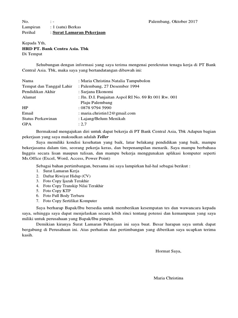 Surat lamaran kerja di bank bca sebenarnya tidak jauh berbeda dengan surat lamaran kerja pada umumnya. Seperti lamaran kerja pada umumnya terdapat beberapa hal yang harus diperhatikan ketika menyusun surat lamaran kerja di bank bca antara lain. Ardina rasti tempat tanggal lahir. Contoh surat lamaran kerja di bank mandiri bni bri bca contoh surat lamaran kerja di bank bekerja di bank mungkin bagi sebagian orang merupakan salah satu impian. Apa bedanya dengan surat lamaran kerja lainnya. Surat lamaran kerja di bank bca sebenarnya tidak jauh berbeda dengan surat lamaran kerja pada umumnya.