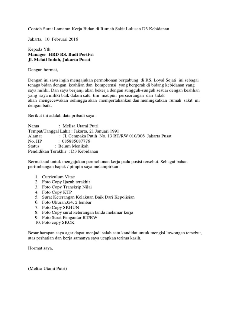 Contoh surat lamaran kerja bidan adalah surat lamaran yang dibuat untuk melamar pada posisi bidan. Hal ini bisa kita buktikan dengan semakin banyaknya orang yang memilih jurusan kesehatan saat menempuh pendidikan tinggi. 15 contoh surat lamaran kerja di rumah sakit berbagai posisi bekerja di suatu rumah sakit tentu merupakan impian yang sangat besar bagi seseorang. Contoh surat lamaran kerja di rumah sakit adalah merupakan postingan yang akan saya bahas pada kesempatan yang berbahagia ini untuk kamu para pengunjung setia semuanya khususnya bagi kamu yang ingin melamar pekerjaan di rumah sakit tentunya akan membutuhkan referensi dalam membuat surat lamaran kerja di rumah sakit maka tetaplah berada di halaman ini karena disini saya akan memberikan. Contoh surat lamaran kerja sangat dibutuhkan bagi kamu yang ingin mendapatkan pekerjaan terutama di rumah sakit. Contoh surat lamaran kerja di rumah sakit tentunya sangat diperlukan bagi mereka yang berencana melamar pekerjaan di rumah sakit.
