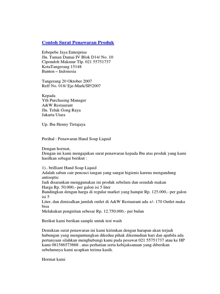 Contoh surat penawaran produk. Mau buat surat buka dulu contohsuratindonesia. Jika anda seorang pebisnis memilki produk yang baik maka tentunya anda ingin produk anda laku keras dan dapat memberikan profit bagi anda. Contoh surat penawaran semakin hari persaingan bisnis semakin ketat. Terlebih untuk anda yang masih sekolah dan kuliah mungkin saja mendapatkan tugas untuk menulis surat penawaran. Seperti penawaran harga rumah penawaran harga komputer dll. Contoh surat penawaran barang produksurat penawaran adalah sebuah surat yang digunakan untuk menawarkan sebuah harga barang elektronika gadget motor mobil dll maupun sebuah jasa hubungan kerjakerjasama yang di lontarkan pada sebuah surat yang bertujuan untuk membuat sebuah ikatan kerja sama anrata pihak penjual dengan pihak pembeli.