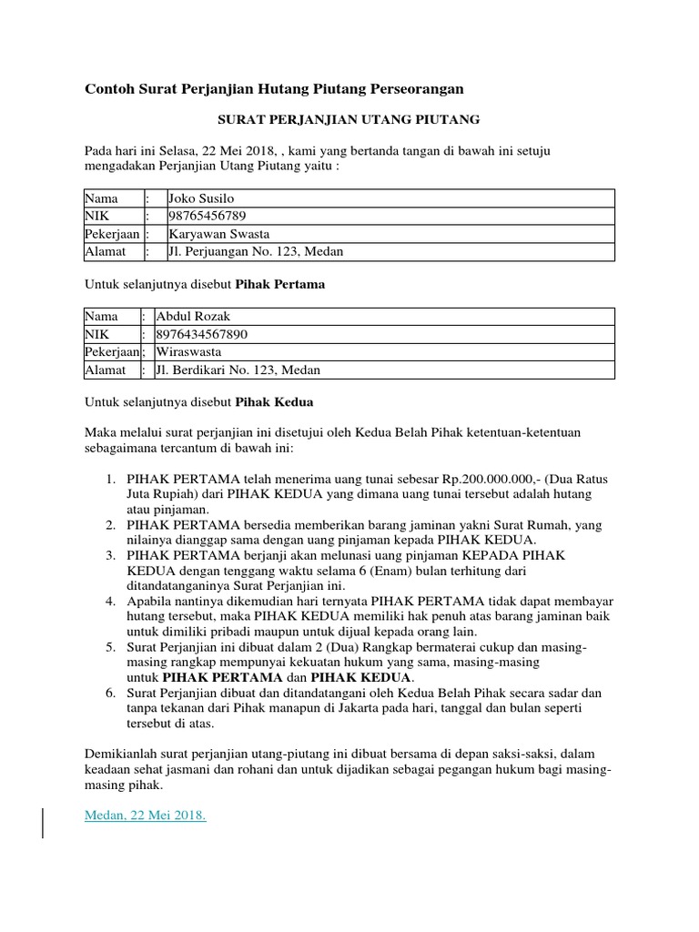 51 pada hari ini kamis 21 juni 2012 menghadap kepada saya frid hutagalung sarjana hukum notaris di jl. Termasuk di dalamnya mengenai jaminan yang dberikan oleh orang yang berhutang kepada si pemberi hutang. Namun agar lebih terstruktur dan memiliki bukti fisik maka kedua belah pihak biasanya akan menggunakan surat perjanjian. Contoh surat perjanjian hutang piutang 3. Anda dapat melihat dan mendapatkan file contoh surat perjanjian hutang piutang dengan jaminan atau tanpa jaminan yang cukup sederhana tapi sangat kuat kebsahannya pada tautan tersebut. Jadi hanya merubah identitas dan keperluannya saja.