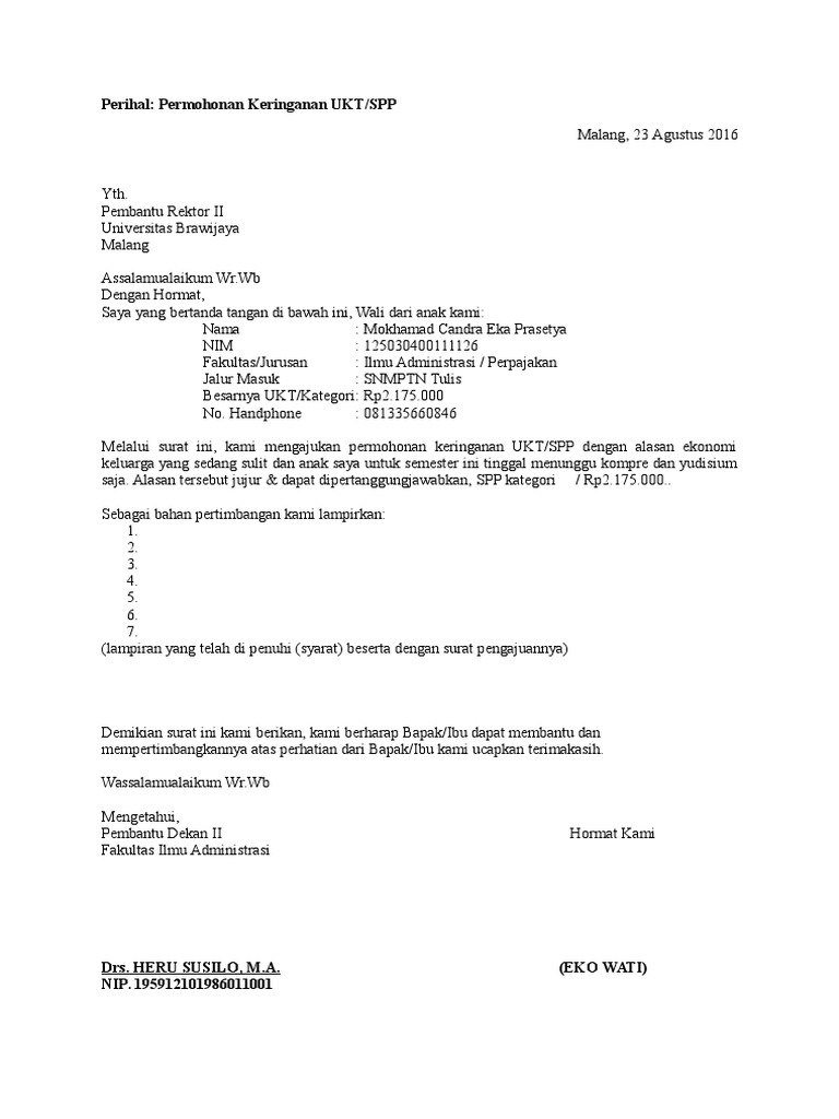 Contoh surat permohonan penurunan ukt. Sebagai bahan pertimbangan saya lampirkan pula fotokopi kartu tanda mahasiswa fotokopi kartu tanda penduduk ktp orang tua fotokopi kartu keluarga surat keterangan belumtidak mampu secara ekonomi dari desakelurahan dan fotokopi rekening listrik. Eka agustina npm 1514051025 fakultas jurusan pertanianteknologi hasil pertanian jalur masuk. 5 contoh surat permohonan keringanan biaya sekolah kuliah yang benar bisa menempuh sekolah dan perkuliahan dengan lancar tanpa terkendala biaya adalah impian setiap orang. Ana k kedua saya sedang dalam jenjang pendidikan sma dan ank saya yang ketiga smp dan ank ke empat dan kelima sd. Namun masalah ekonomi yang tidak dapat diprediksi terkadang berimbas pada kegiatan sekolah atau perkuliahan. Penghasilan saya yang sedemikian digunakan untuk membiayai kehidupan sehari hari anak dan istri saya.