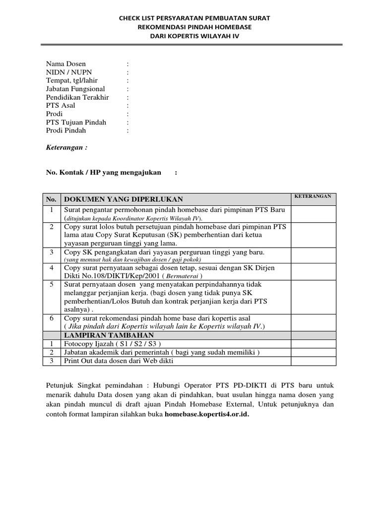 Jika anda menyukai contoh contoh ini mohon sumbangan like twit atau dengan berkomentar di bawah ini. Saya berharap bapak ibu sekalian dapat pindah ke tempat baru yang diinginkan agar bisa lebih dekat dengan keluarga tercinta. Surat pernyataan dosen tetap yang melakukan proses pindah homebase pdpt adalah operator institusi lama dan baru setelah sdh berhasil meng upload berkas2 tersebut selanjutnya menunggu proses di dikti yang kurang lebih butuh waktu satu bulandan status pdpt anda sudah berhasil pindah ke institusi pts baru. Scan warna surat pengantar permohonan pindah homebase dari pimpinan pt baru ditujukan kepada kepala lldikti wilayah iv scan warna surat lolos butuh persetujuan pindah homebase dari pimpinan pt lama atau copy surat keputusan sk pemberhentian dari ketua yayasan perguruan tinggi yang lama atau surat pernyataan yang menyatakan perpindahannya tidak melanggar perjanjian kesepakatan kerja. Dalam rangka penataan sistem ketenagaan perguruan tinggi serta menindak lanjuti surat kami nomor 28991e412011 tanggal 11 oktober 2011 dan nomor 1139e412012 tanggal 13 april 2012 perihal pengajuan nidn dan perubahan data dosen lainnya bersama ini kami menegaskan. Demikianlah beberapa contoh surat permohonan mutasi atau pindah tugas kerja pns.