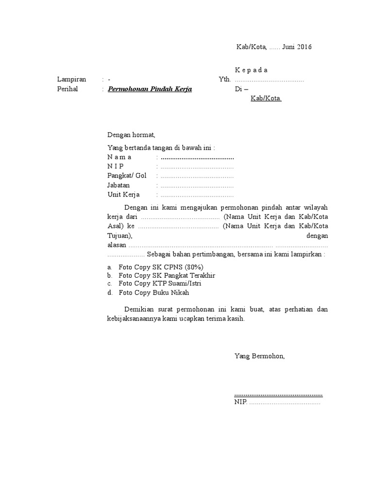 Tapi yang jelas selain surat pindah ada beberapa dokumen yang harus anda sertakan agar bagian kepegawaian dapat mengkaji dan mengabulkan permintaan mutasi anda ke daerah lain. Adapun permohonan pertukaran tempat kerja boleh menjadi satu perkara yang mudah apabila ada persetujuan untuk pertukaran suka sama suka diantara pemohon. Dalam penulisan sebuah surat kadang kala kita bingung harus dimulai dari mana.