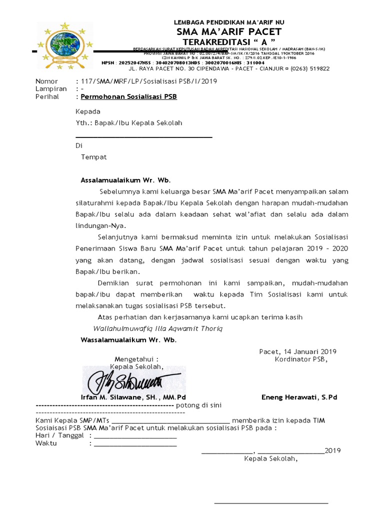 Contoh surat permohonan sosialisasi. Surat keterangan aktif mengajar skam tata tertib siswa smk negeri 1 sragi. Surat ijin sosialisasi ppdb 2015. 15 contoh surat permohonan kerjasama di berbagai bidang sebagai suatu perusahaan yang ingin maju dan berkembang maka tentu harus menjalin kerjasama dengan perusahaan lain maupun berbagai pihak lain. Contoh surat permohonan sosialisasi ppdb kop sekolah nomor. Jika anda membutuhkan referensi contoh surat undangan resmi yang ditujukan kepada kepala sekolah se kecamatan silahkan disimak contoh surat berikut ini. Demikian contoh surat permohonan sosialisasi toefl yang dikirimkan oleh lembaga kursus bahasa inggris ke pimpinan sebuah pondok pesantren.