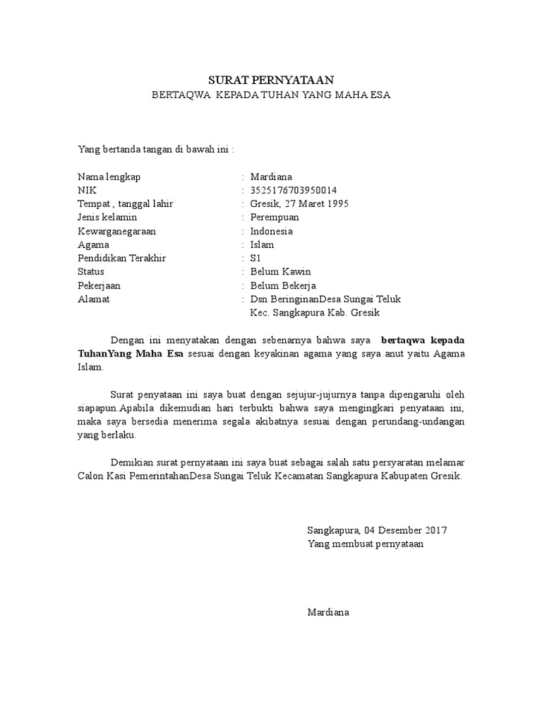 Surat pernyataan bertaqwa kepada tuhan yang maha esa ini memiliki format sebagai berikut. Khususnya bagi anda yang membutuhkan surat pernyataan itu dalam konteks persyaratan pilkades maupun persyaratan administrasi di bidang lainnya. Semoga contoh surat ini bermanfaat. Contoh format surat pernyataan bertaqwa kepada tuhan yang maha esa. Apa fungsi surat pernyataan bertaqwa kepada tuhan yang maha esa cara membuat surat pernyataan bertaqwa kepada tuhan yang maha esa bukti pernyaataan bahwa setia kepada pancasila sila pertama persyaratan melamar menjadi pegawai pemerintah kelurahan desa pns contoh surat pernyataan bertaqwa kepada tuhan yang maha esa kelurahan desa saya bertaqwa kepada tuhan yang maha esa sesuai agama dan. Surat pernyataan tersebut terdiri dari biodata nama lengkap tempat tanggal lahir jenis kelamin status perkawinan pekerjaan lamat lengkap.