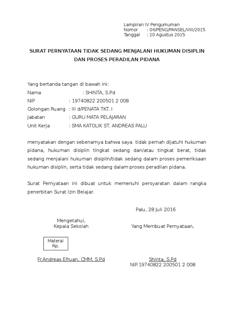 Contoh surat pernyataan tidak pernah dijatuhi pidana. Untuk lebih jelas sebaiknya perhatikan contoh surat pernyataan dari beberapa fungsi. Untuk mendownload contoh format surat pernyataan tidak pernah dijatuhi hukuman disiplin tingkat sedang berat klik disini doc. Contoh surat pernyataan tidak pernah di pidana atau tidak sedang menjalani hukuman pidana oleh bangdidav 04 sep 2018 posting komentar surat keterangan tidak pernah dipidana yang dikeluarkan oleh pengadilan negeri merupakan salah satu persyaratan yang harus dipenuhi bagi kamu yang ingin mencalonkan diri sebagai caleg lurah camat hingga gubernur. Surat pernyataan tidak sedang menjalani hukuman pidana penjara surat pernyataan tidak pernah dijatuhi pidana penjara berdasarkan putusan pengadilan surat pernyataan tidak pernah melakukan tindak pidana contoh surat pernyataan tidak pernah dihukum penjara untuk cpns surat keterangan tidak pernah terlibat dalam kasus hukum yang di tandatangani di atas materai 6000 surat pernyataan tidak. Namun untuk urusan komunikasi perusahaan maupun berbagai lembaga maupun instansi pemerintah penggunaan surat masih merupakan sesuatu hal yang wajib untuk dilakoni. Tulis alamat lengkap sesuai ktp dengan ini menyatakan yang sebenarnya bahwa saya tidak pernah dijatuhi hukuman atau tidak sedang menjalani penjara.