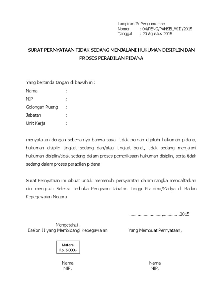 Contoh surat pernyataan selamat datang di portal hidupsimpel pada kesempatan kali ini kita akan membahas lengkap 11 contoh surat pernyataan saya kalau buat tidak nanggung nanggung. Selain itu surat pernyataan biasanya dibuat secara sengaja hal tersebut dibuktikkan dengan adanya sebuah kata kata yang. Contoh surat pernyataan tidak pernah dijatuhi pidana judul surat yang bertanda tangan di bawah ini nama. Selain contoh surat diatas ada juga yang harus melampirkan surat kesediaan ditugaskan diseluruh skpd. Tulis nama lengkap sesuai ktp nik. Sebenarnya contoh format surat pernyataan tidak pernah dijatuhi hukumun disiplin pns itu tersedia dalam lampiran keputusan kepala badan kepegawaian nomor 12 tahun 2002 pada tanggal 17 juni 2002.