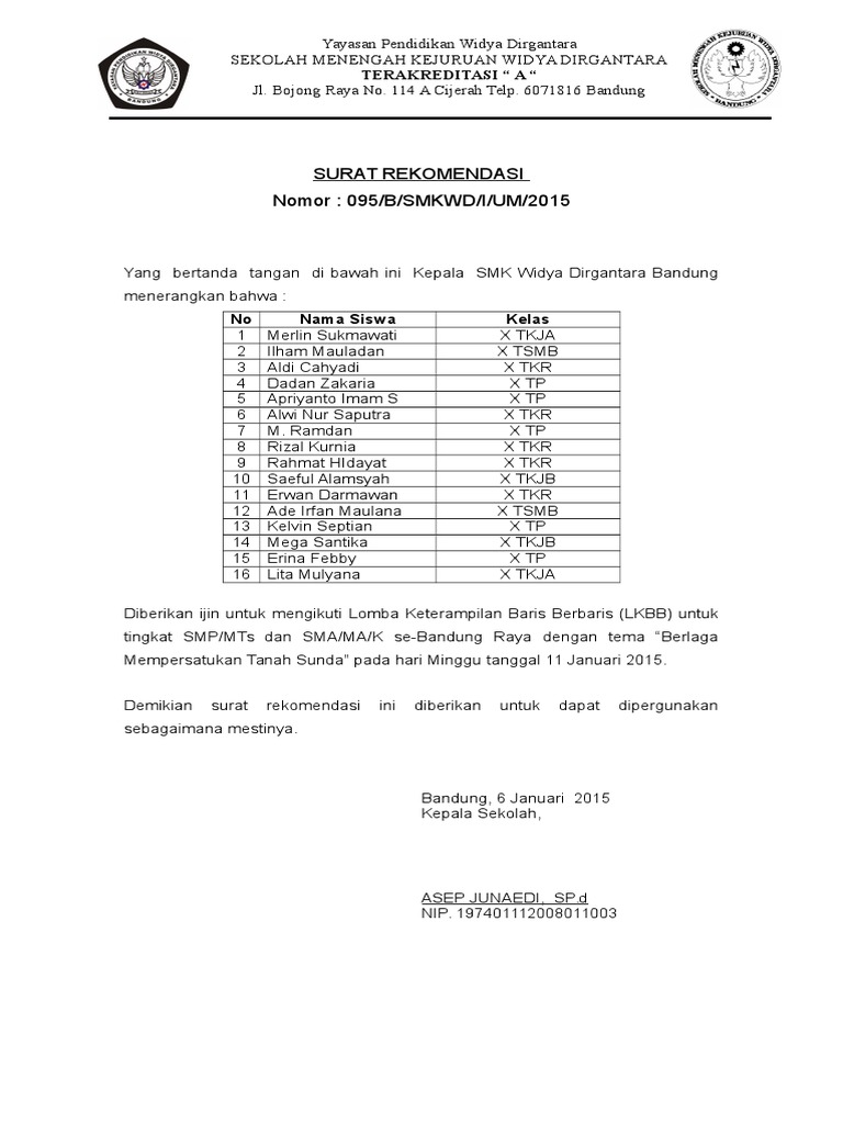 Pihak ketiga yang menentukan hasil seleksi tersebut akan mempertimbangkan apakah siswa tersebut layak untuk mengikuti program berdasarkan apa yang tertulis di surat rekomendasi. Surat rekomendasi untuk mengikuti sebuah program biasanya dikeluarkan oleh pihak sekolah misalnya seorang siswa akan mengikuti acara tertentu dan membutuhkan seleksi tertentu. Sekiranya hampir sama dengan surat rekomendasi diatas surat rekomendasi yang satu ini pun dibuat oleh pihak sekolah untuk kepentingan para muridnya. 15 contoh surat rekomendasi yang baik dan paling lengkap jika diartikan secara sederhana maka surat rekomendasi bisa diartikan sebagai surat yang dibuat oleh seorang pimpinan atau pejabat tertentu yang berisi keterangan tentang seseorang berdasarkan fakta fakta yang ada. Dalam rangka kegiatan lomba entah itu di sekolah atau madrasah yang sifatnya bertingkat berjenjang ataupun tidak sering kali dibutuhkan yang namanya surat rekomendasi mengikuti kegiatan lomba bagi siswa atau santri. Inilah surat rekomendasi sekolah mengikuti lomba.