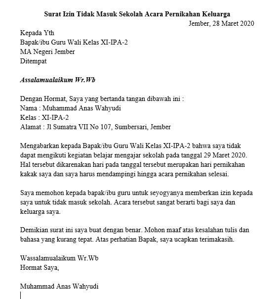 Namun tentu saja izin tidak masuk sekolah harus disampaikan agar wali kelas atau guru memahami kondisi anak. Contoh surat izin sakit tidak masuk sekolah. Meskipun surat ini masih tergolong sebagai surat pribadi dalam penulisan surat izin sekolah ini berbeda saat kita menulis sebuah surat untuk teman kita. Surat tidak hadir ke sekolah atau cuit sakitramai ibu bapa dan pelajar yang banyak membuat carian tentang contoh surat rasmi tidak hadir ke sekolah. Namun sebagai seorang siswa kamu juga tidak bisa memandang rendah pendidikan dan tidak masuk sekolah begitu saja. Yang terhormat bapakibu guru wali kelas 3 sd pelita bangsa di tempat dengan hormat saya yang bertanda tangan di bawah ini adalah orang tuawali murid dari.