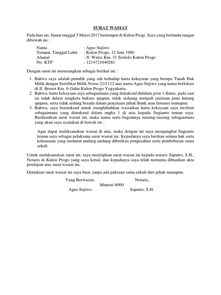 Surat wasiat umum atau surat wasiat dengan akta umum harus dibuat di hadapan notaris pasal 938 939 kuh perdata. Contoh surat wasiat tanpa notaris dengan berbagai format sebagai referensi dalam membuat surat wasiat yang baik dan resmi. Surat wasiat rahasia atau tertutup yang pada saat penyerahannya pewaris harus menandatangani penetapan penetapannya baik jika dia sendiri yang menulisnya ataupun jika ia menyuruh orang lain untuk menulisnya. Meski adanya sebuah surat wasiat tidak menjamin tidak terjadinya konflik namun hal tersebut dapatlah dijadikan sebagai salah satu surat pernyataan yang kuat untuk menyelesaikan sengketa. Surat wasiat menurut kuhper maupun menurut khi harus memenuhi syarat formal pembentukannya yaitu menurut kuhper harus dibuat secara tertulis dengan dua orang saksi dan melalui notaris. Meski adanya sebuah surat wasiat tidak menjamin tidak terjadinya konflik namun hal tersebut dapatlah dijadikan sebagai salah satu surat pernyataan yang berpengaruh untuk merampungkan sengketa.