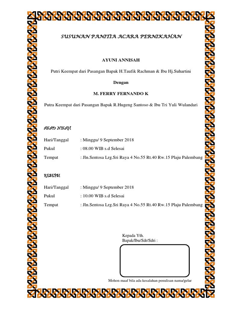 Pada file di bawah ini undangan sudah dalam format kertas folio f4 border dan hiasan di sudut sudutnya dan desain sesuai preiew di atas download contoh undangan rapat panitia pernikahan. 15 contoh surat undangan untuk berbagai keperluan doc terlengkap. Menyelenggarakan pesta pernikahan yang sukses tidak dapat dilepaskan dari pihak pihak yang turut berperan di dalamnya. Dengan adanya panitia yang kompak dalam bertugas acara. Meskipun anda sudah menggandeng wedding organizer wo panitia dari pihak keluarga dan orang orang terdekat sangat penting. Buku panduan pernikahan donna tomodoc.