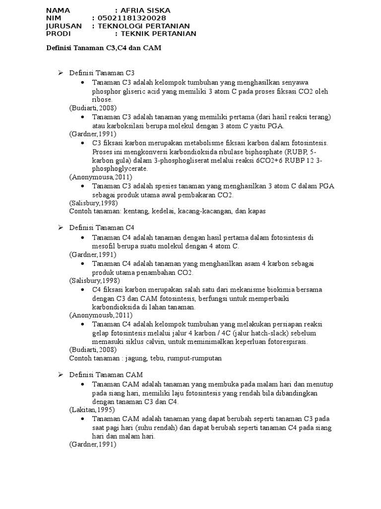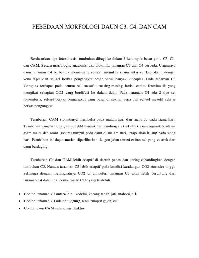 Contoh tanaman c3 c4 dan cam. Pada saat siklus calvin senyawa pertama yang melakukan fiksasi co 2 adalah fosfogliserat molekul berkarbon 3 dengan bantuan enzim rubisco sehingga lintasan tersebut dinamakan c3. Sedangkan jenis tanaman c4 contohnya adalah tebu jagung dan sorgum. Tanaman c3 lebih adaptif pada kondisi kandungan co 2 atmosfer tinggi. Akan tetapi tanaman c4 lebih mudah beradaptasi di lahan yang memiliki kadar co2 tinggi. Tumbuhan c4 dan cam. Tumbuhan cam adalah tumbuhan yang stomatanya membuka pada malam hari dan menutup pada siang hari memiliki laju fotosintesis yang rendah bila dibandingkan dengan tanaman c3 dan c4 lakitan 1995.