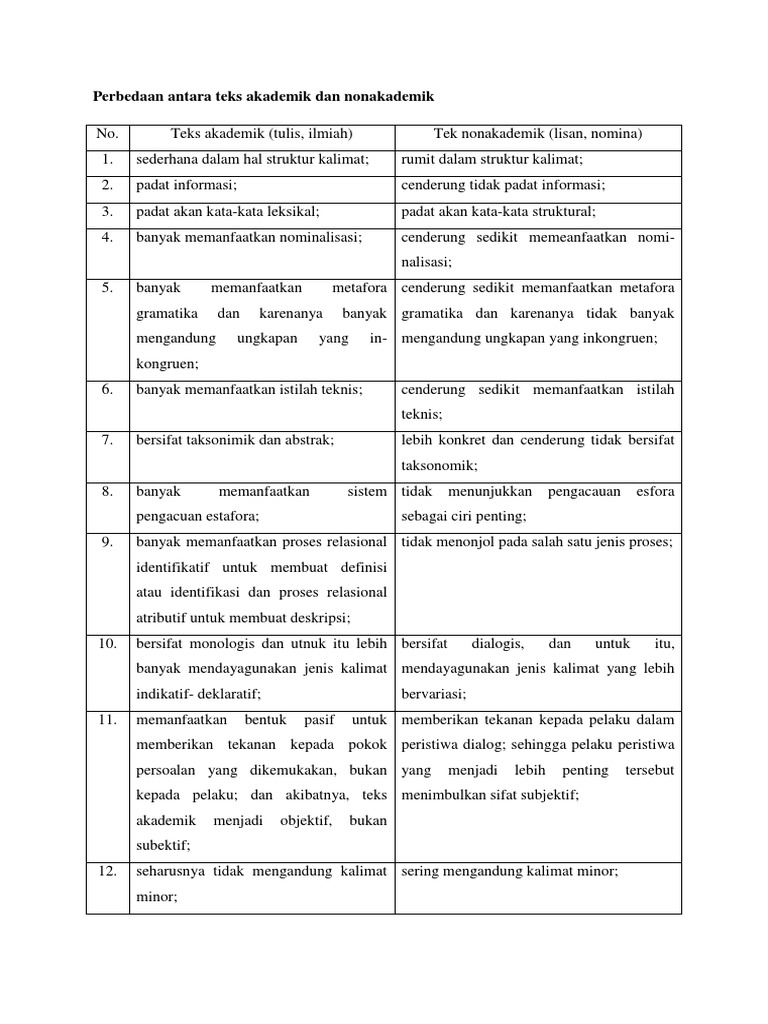 Ciri ciri teks akademik dan non akademik contoh teks akademik. Teks akademik atau ilmiah berbeda dengan teks teks lain seperti karya sastra jurnalistik atau laporan perjalanan. Pendapat tentang teks akademik yang berkembang selama ini adalah bahwa teks akademik mempunyai ciri ciri antara lain sederhana padat objektif dan logis lihat misalnya sudaryanto 1996 moeliono tanpa tahun. Kadang kadang kalimat kalimatnya panjang teknis dan menyertakan pelbagai istilah jargon yang kurang lazim bagi orang awam. Implementasi kebijakan gerakan literasi sekolah di sekolah. Non akademik adalah kebalikan dari pengertian akademik.