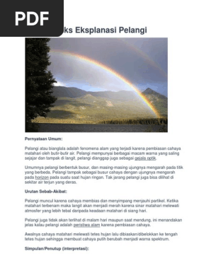 Jika kalian terburu buru berikut contoh teks eksplanasi pelangi beserta strukturnya yang bersumber dari ilmu pengetahuan populer untuk anak2007 karya hotimah dan mhariwijaya. Pelangi mempunyai berbagai macam warna yang saling sejajar dan tampak di langit pelangi dianggap juga sebagai gejala optik. Oleh karenanya tak jarang jika fenomena ini sering dibahas dalam pelajaran bahasa indonesia salah satunya dalam bab teks eksplanasi. Berikut ada beberapa contoh teks eksplanasi tentang fenomena alam yang ada di sekitaran kita yang diantaranya sebagai berikut. Pelangi terbentuk melewati proses pembelokkan cahaya atau yang di sebut dengan pembiasan proses pembiasan pada pelangi akan tertata secara struktur dan akan menghasilkan warna warni indah pada pelangi. Artikel ini merupakan referensi yang tepat bagi kamu yang sedang ingin mempelajari dan menulis teks eksplanasi karena di dalam artikel ini terdapat pengertian dan berbagai macam contoh teks eksplanasi lengkap beserta strukturnya.