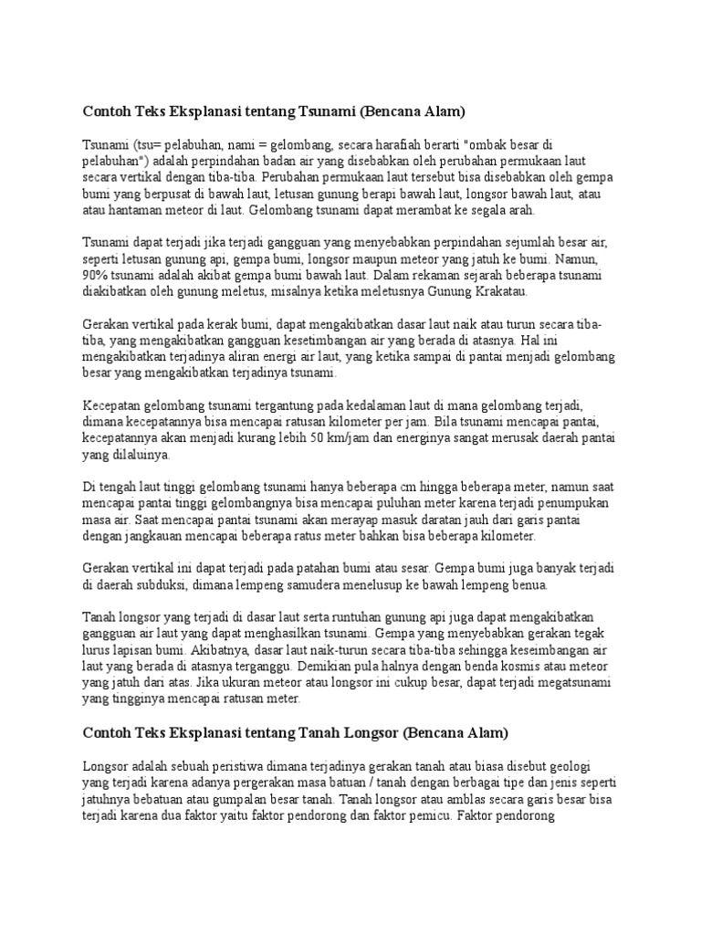 Banyak sekali peristiwa alam yang terjadi di bumi kita seperti tsunami banjir gunung meletus tanah longsor indahnya pelangi dan masih banyak yang lainnyanah mengapa dan bagaimana suatu peristiwa tersebut bisa terjadi. Teks eksplanasi merupakan teks yang berisi mengenai proses mengapa dan bagaimana suatu ilmu pengetahuan peristiwa alam sosial budaya serta hal lainnya bisa terjadi. Contoh teks eksplanasi tentang tanah longsor teks eksplanasi adalah teks yang berisi penjelasan lengkap dan mendalam terhadap suatu hal yang secara umum membahas mengenai fenomena yang terjadi di sekitar kehidupan manusia. Berikut ini terdapat beberapa contoh teks eksplanasi antara lain sebagai berikut. Tanah longsor juga bisa dikatakan sebagai fenomena amblasnya tanah atau bebatuan dari suatu ketinggian. Adanya tanah longsor disebabkan oleh dua faktor yaitu faktor pemicu dan faktor pendorong.