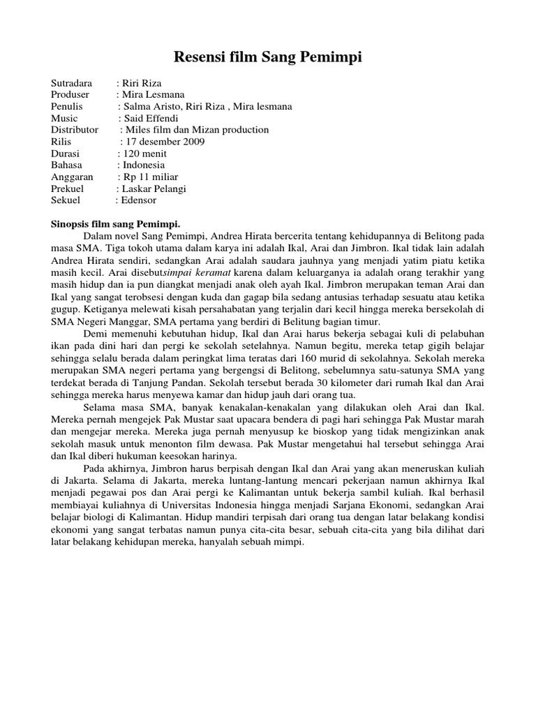 Semoga apa yang admin bagikan ini dapat membantu anak didik dan juga bapakibu guru dalam mencari referensi terbaru seputar bahasa indonesia teks ulasan. Contoh teks ulasan setelah kita mengetahui masing masing penjelasan mengenai berbagai teks diartikel sebelumnya. Karya yang biasanya dibuat ulasannya adalah dapat berupa cerpen singkat puisi novel buku film album lagu produ ataupun berita. Disaat mengulas sebuah karya kita harus bersikap kritis agar berkontribusi untuk kemajuan karya tersebut ke depannya. Sang pemimpi ialah sebuah novel karya dari andrea hirata serta menjadi buku kedua dari pada tetralogi laskar pelangi. Contoh teks ulasan film sang pemimpi singkat beserta strukturnya written by ivanwira sunday march 5 2017 add comment semuacontoh yoo para pembaca dan pelajar kali ini saya akan membagikan contoh singkat teks ulasan film indonesia sang pemimpi yang merupakan salah satu materi pembelajaran bahasa indonesia yang mungkin teman teman butuhkan untuk referensi mengerjakan tugas.