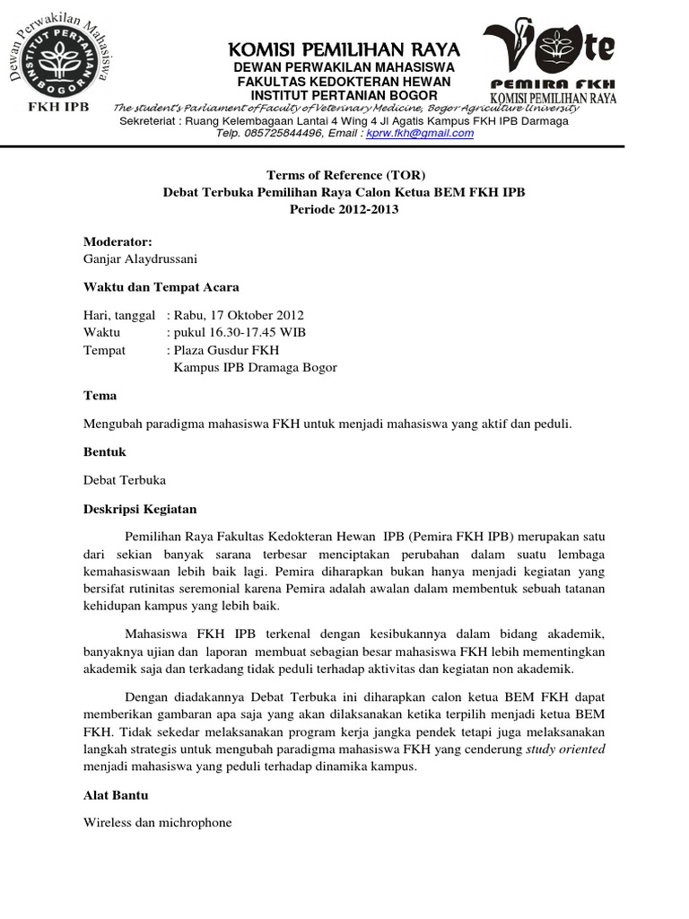 Contoh tor kegiatan mahasiswa. Demikianlah setidaknya beberapa prihal mengenai contoh tor kegiatan awal akhir lengkap. Kerangka acuan kegiatan term of reference seminar kewirausahaan umkm dewan mahasiswa ekonomi islam tahun 2016 kementerian. Badan eksekutif mahasiswa s1 fakultas matematika dan ilmu pengetahuan alam universitas padjadjaran. Sedekdar tambahan tulisan di atas tentunya masih ada hal hal yang barangkali diangga penting bagi pelaksana kegiatan oleh karenannya hal hal lainnya yang mungkin bisa berpengaruh dalam makanisasi organisasi untuk pelaksanaan kegiatan bisa ditambahkan. Kertas dooslah warna merah. Judul kegiatan tanggal kegiatan.