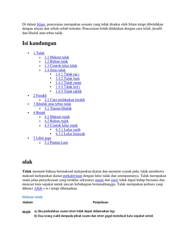 Ada ucapan yang secara tegas walau tanpa disertai niat membuat talak itu sah. Talak ba in kubro besar talak ba in kubro adalah talak di mana suami tidak bisa kembali kepada istri baik pada masa iddahnya begitu pula setelah masa iddah kecuali dengan akad dan mahar baru dan setelah mantan istri menikah dengan laki laki lain. Talak sharih atau langsung adalah ucapan talak yang langsung jelas dan dimengerti dengan baik. Contoh surat talak merupakan pernyataan yang dikeluarkan oleh suami kepada istri untuk menceraikan istri secara agama islam. Talak atau cerai adalah suatu permasalahan rumah tangga yang saat ini banyak menimpa suami istri. Kadang karena ketidak tahuan akan talak yang menyebabkan dengan sendirinya talak itu jatuh.