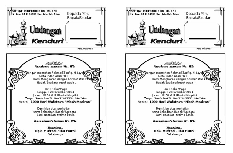 Format undangan microsoft word berikut ini kami bagikan beberapa contoh format atau file undangan dari berbagai macam acara seperti walimatul ursy walimatul khitan selapanan tahlil 40 hari 100 hari pendak 1 dan 2 seribu hari haul walimatul aqiqah karena sering kali kita kesulitan untuk mencari format atau contoh undangan seperti walimatul haji tingkepan acara rapat semuanya bisa. Model undangan seri 2b selamatan hajidoc. Contoh surat undangan tahlil 40 100 1000 hari. Download undangan microsoft word berikut ini kami akan share beberapa contoh format atau file undangan dari berbagai macam acara seperti walimatul ursy walimatul khitan selapanan tahlil 40 hari 100 hari pendak 1 dan 2 seribu hari haul walimatul aqiqah karena sering kali kita kesulitan untuk mencari format atau contoh undangan seperti walimatul haji tingkepan acara rapat semuanya. Model undangan seri 2b 40 haridoc. Contoh surat undangan tahlil 40 100 1000 hari haul by ataratu.