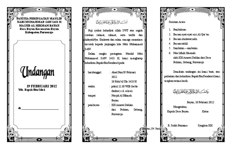 Contoh format surat undangan pernikahan ini dibuat untuk semua kalangan border dan kata kata ucapan yang ada sangat mudah dirubah. Undangan lipat tiga warna hijau dinaprint harga undangan lipat 3 amat sangat dibutuhkan pertama kali oleh seseorang saat akan membuat sebuah acara yang melibatkan tidak sedikit orang seperti perkawinan aqiqah khitanan dan lain lain. Dengan mohon rahmad dan. Contoh undangan nikah hvs f4 lipat 3 file docx. Undangan tahlil ini dibuat dalam format kertas a4 dalam contoh template ini ukuran a4 lipat 3tahlil lipat 3 free download as word doc doc pdf file pdf text file txt or read online for free. Mohon maaf apabila banyak kesalahan dalam penulisan artikel atau informasi tersebut yang ada kaitannya dengan format undangan lipat 3 cdr yang sangat populer.