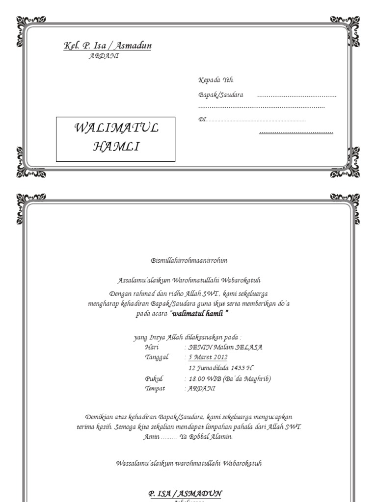 Contoh undangan walimatul hamli. Namun andai dikau berkehendak dikau dapat dg mudah mendapatkan informasi ongkos free download contoh undangan walimatul hamli dan dagangan tanpa halangan dari tokonya. Jangan ragu menghubungi banner yang ada di samping supaya memperolehnya. Mohon maaf apabila banyak kesalahan dalam penulisan artikel atau informasi tersebut yang ada kaitannya. Informasi undangan yang kami bagikan semoga menjadi informasi terbaik dan bisa benrmanfaat untuk semua khususnya informasi tentang download file undangan walimatul hamli format word terbaru 2020 yang semuanya kami kumpulkan dengan serapih mungkin. Utnuk versi coreldrawnya silahkan anda instal yang versi 11 1213x4 ke atas terserah anda. Berikut contoh undangan walimatul ursnya.